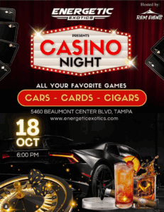 Join Energetic Exotics for an unforgettable evening where high-octane excitement meets sophisticated style, all in support of a meaningful cause. Experience the thrill of all your favorite casino games, the allure of supercars on display, and the indulgence of a premium cigar lounge, all under one glamorous roof.
